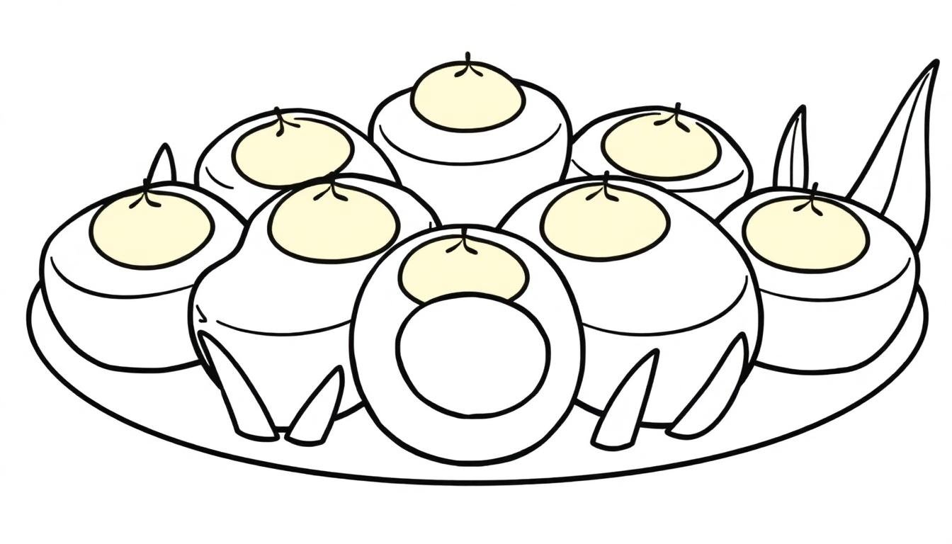 데블드에그는 삶은 달걀의 노른자를 파내어 마요네즈, 겨자, 그리고 다양한 향신료와 섞어 다시 흰자 속에 채워 넣은 요리예요. 마치 악마(Devil)가 만든 것처럼 맛있다고 해서 ‘데블드에그’라는 이름이 붙었답니다. 계란 노른자의 고소함과 마요네즈의 부드러움, 그리고 살짝 더해진 겨자의 알싸함이 어우러져 남녀노소 누구나 좋아하는 간식이 되었어요. 생일 파티나 특별한 날, 핑거푸드로도 인기가 많죠! 오늘 준비한 색칠 도안에는 귀엽게 웃고 있는 데블드에그 친구들이 기다리고 있답니다. 어떤 표정을 하고 있는지, 어떤 색으로 옷을 입혀줄지 상상하며 색칠해 보세요!