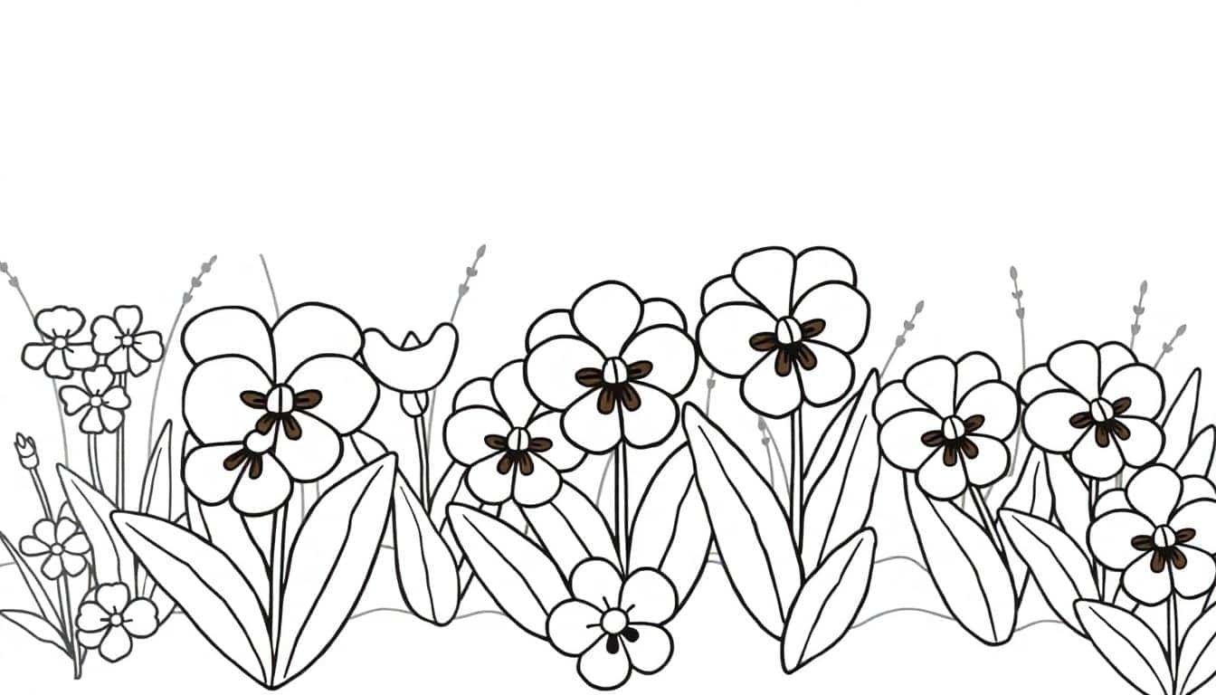 팬지는 정말 다양한 색깔을 가지고 있어요. 보라색, 노란색, 흰색, 심지어는 검은색에 가까운 진한 색까지! 마치 무지개가 땅에 내려앉은 것 같아요. 이 화단에는 여러 가지 색깔의 팬지들이 모여서 서로 이야기를 나누고 있답니다. 아이들은 이 도안을 보면서 어떤 색을 칠할지 상상하게 될 거예요. 평소에 보지 못했던 신기한 색깔을 팬지에게 선물해주는 것도 재미있겠죠?