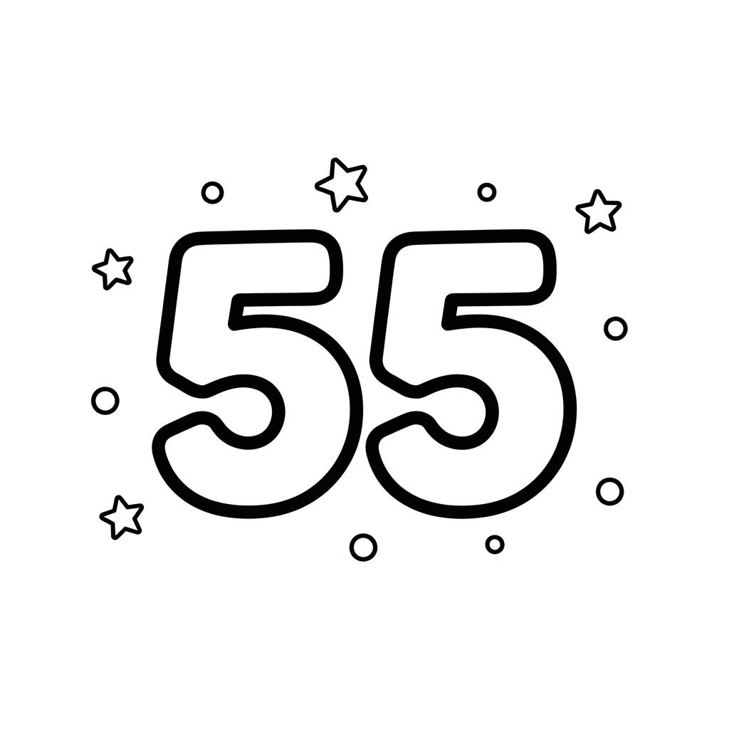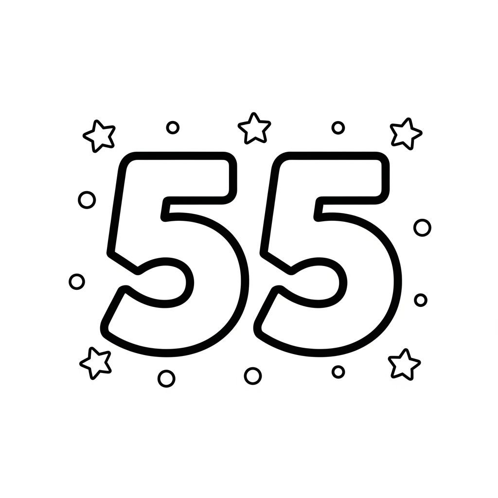 숫자 55를 보면 어떤 생각이 떠오르나요? 혹시 55개의 별이 반짝이는 밤하늘, 55마리의 귀여운 동물 친구들, 아니면 55개의 알록달록한 풍선이 하늘로 두둥실 떠오르는 모습이 상상되나요? 55는 우리 주변에서 생각보다 많은 곳에 숨어있을 수 있어요. 시계의 분침이 55분을 가리키거나, 좋아하는 게임에서 55점을 얻었을 때처럼 말이죠. 아이들이 직접 55를 색칠하면서 이 숫자가 가진 다양한 의미와 재미있는 이야기를 발견하도록 격려해주세요. 자유로운 색깔 선택을 통해 55가 어떤 모습으로 변신할지 기대되지 않나요?